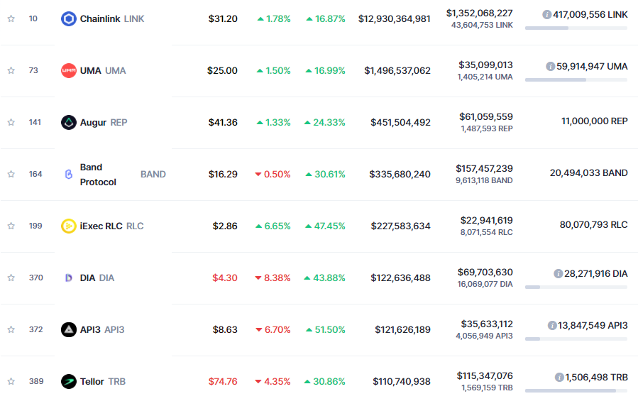 오라클 카테고리를 가진 코인 중, 100위권에 진입한 코인은 체인링크와 우마가 전부입니다. 아직, 오라클 코인들이 고점이 아니라는 결정적인 증거 중에 하나일 것입니다.